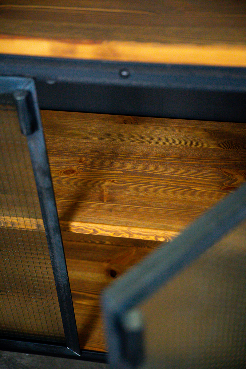 Sercem tego modelu jest dolna komoda wyposażona w dwa solidne drzwi. Zamiast klasycznego drewna czy zwykłej szyby, zastosowaliśmy tu szkło zbrojone o grubości 6 mm. Zatopiona wewnątrz szklanej tafli stalowa siatka nie tylko wzmacnia konstrukcję, ale nadaje jej unikalny, „warsztatowy” sznyt. Szkło to delikatnie rozprasza światło i tylko częściowo zdradza zawartość wnętrza, wprowadzając do pomieszczenia atmosferę tajemnicy i surowego luksusu.